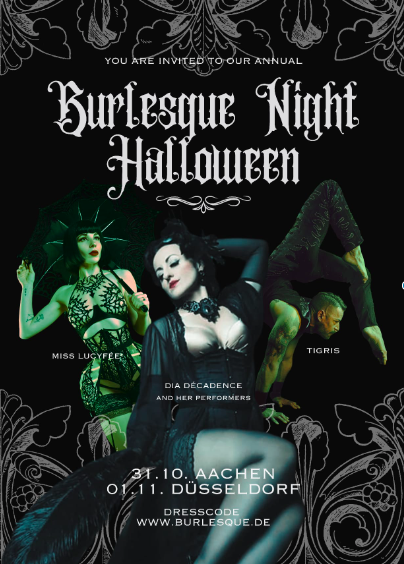 Aachen, am 31.10. und in Düsseldorf, am 01.11. Auf der Bühne der Nacht präsentieren wir Ihnen: La Loba Lucia (Berlin), Kitty Willenbruch (Österreich), Sandy Sure (Grossbritanien) sowie Performer:innen des Dia Décadence Atelier, Miss Wild Desire und Julie Perce Cœur und weitere. Dia Décadence präsentiert persönlich die Burlesque Night Halloween Show und steht auf der Showbühne. Geniessen Sie die professionellen Performances aus den Bereichen Burlesque-Kunst, Akrobatik sowie Halloween und erleben Sie mit uns eine einzigartige Nacht der Burlesque Lebenslust!